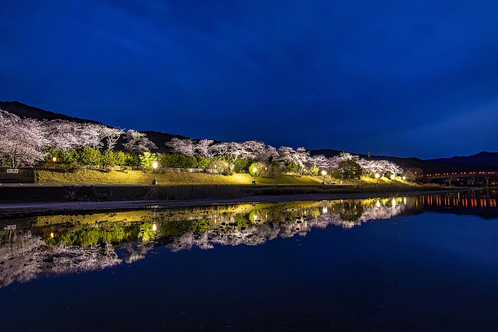 満開時は日没より、五十鈴川河川敷周辺をライトアップします。五十鈴川の水面に映る幻想的な桜もお楽しみください。