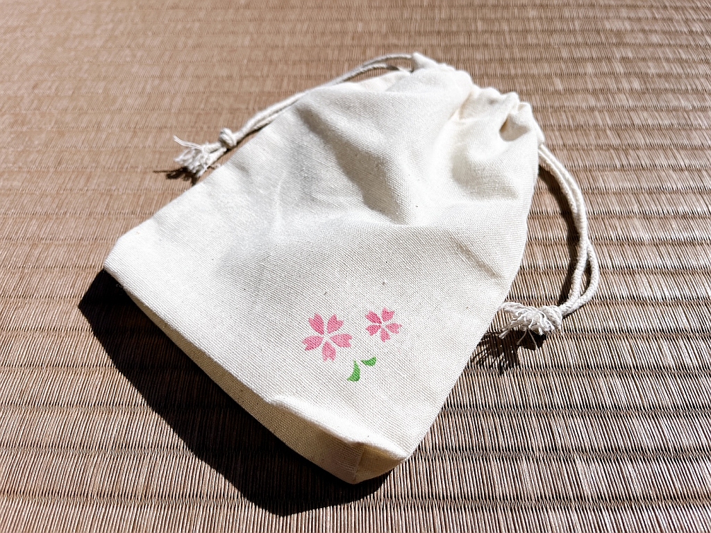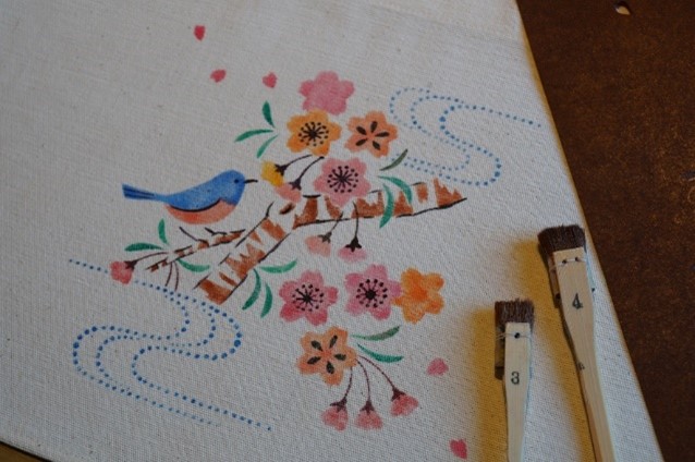 小さな巾着に、桜模様の伊勢型紙を使って型染めをします。
