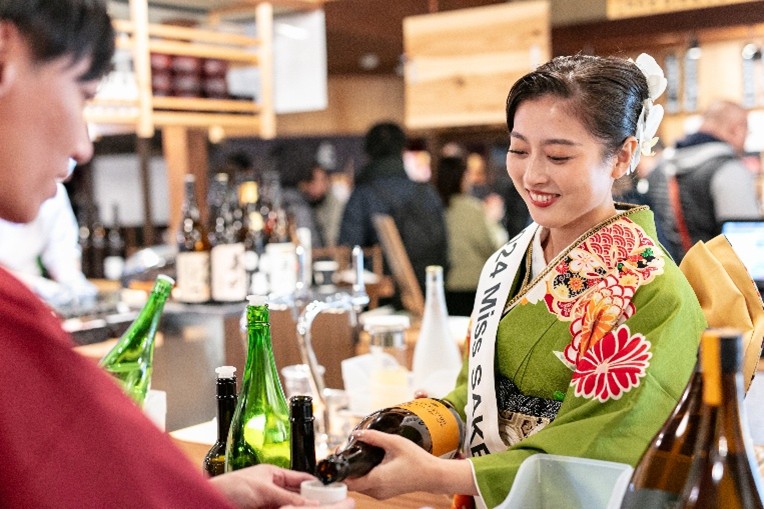 伝統的な日本酒と日本文化の魅力を国内外に発信するアンバサダーMiss SAKEグランプリストが来場。各飲み比べブースにてお酒をお注ぎします。