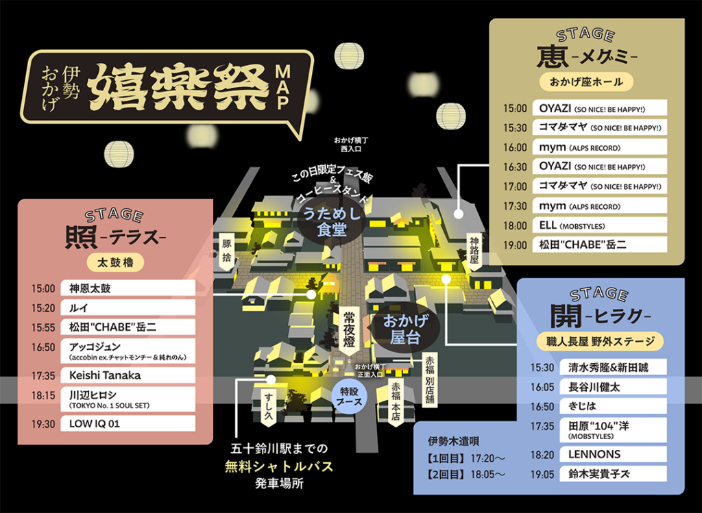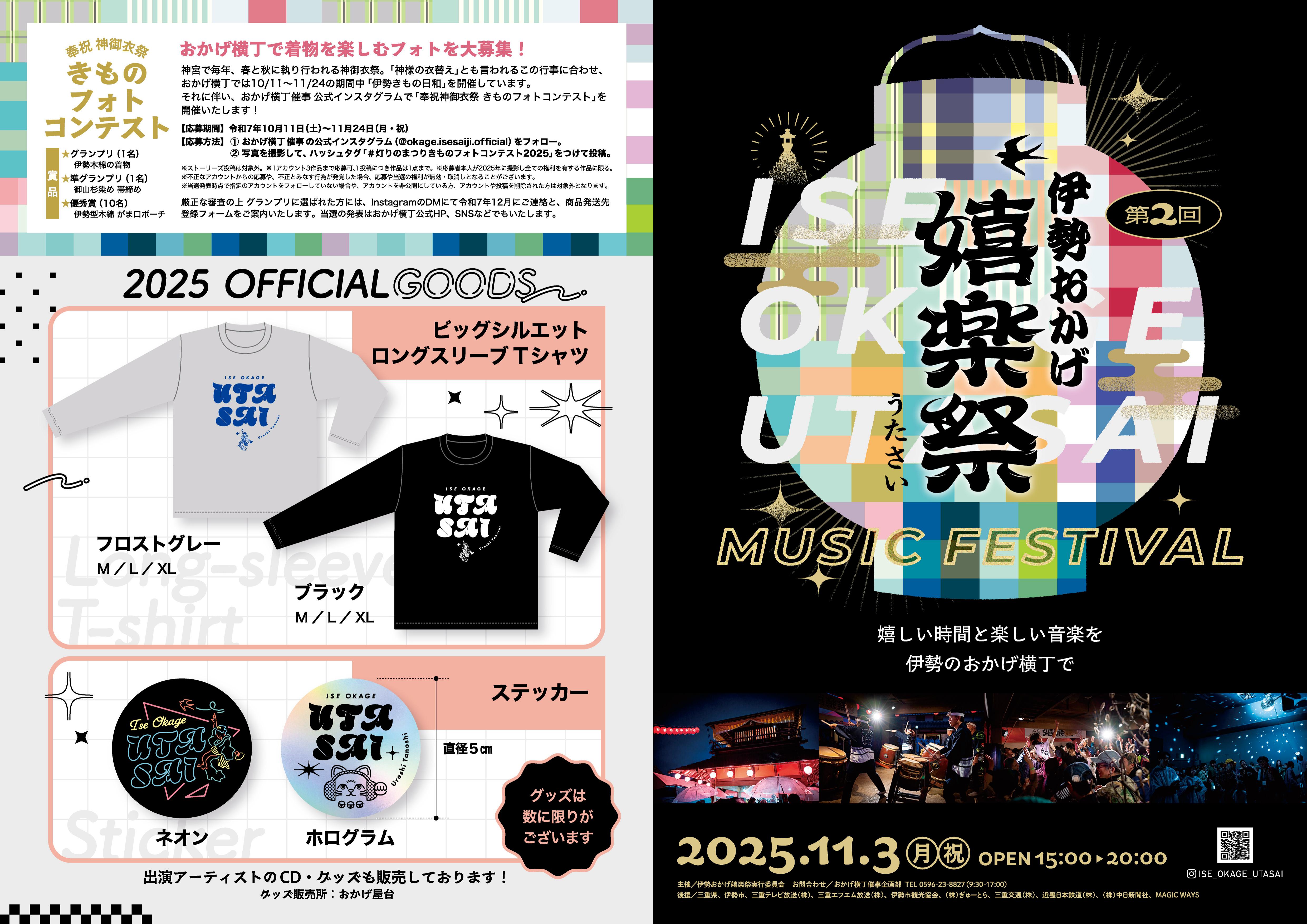 おかげ横丁では新嘗祭をお祝いして、稔りへの感謝と念と共に、音楽を通して嬉しい楽しい(歌の語源とされる)ひとときを神様にお捧げして、集う人々と一緒に楽しむお祭りです。