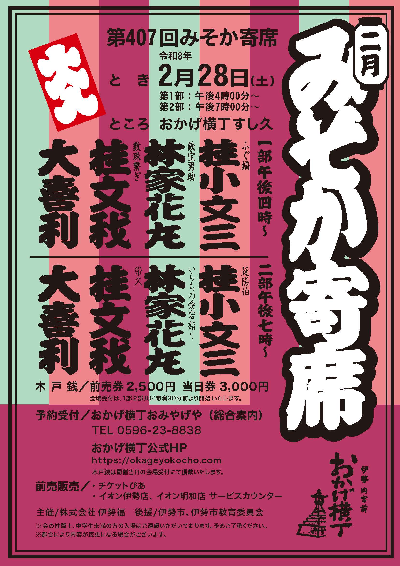 幅広い活躍で芸術推奨文部大臣新人賞を受賞した、地元松阪出身の桂文我師匠を中心に、中堅・若手の噺家が多数出演。