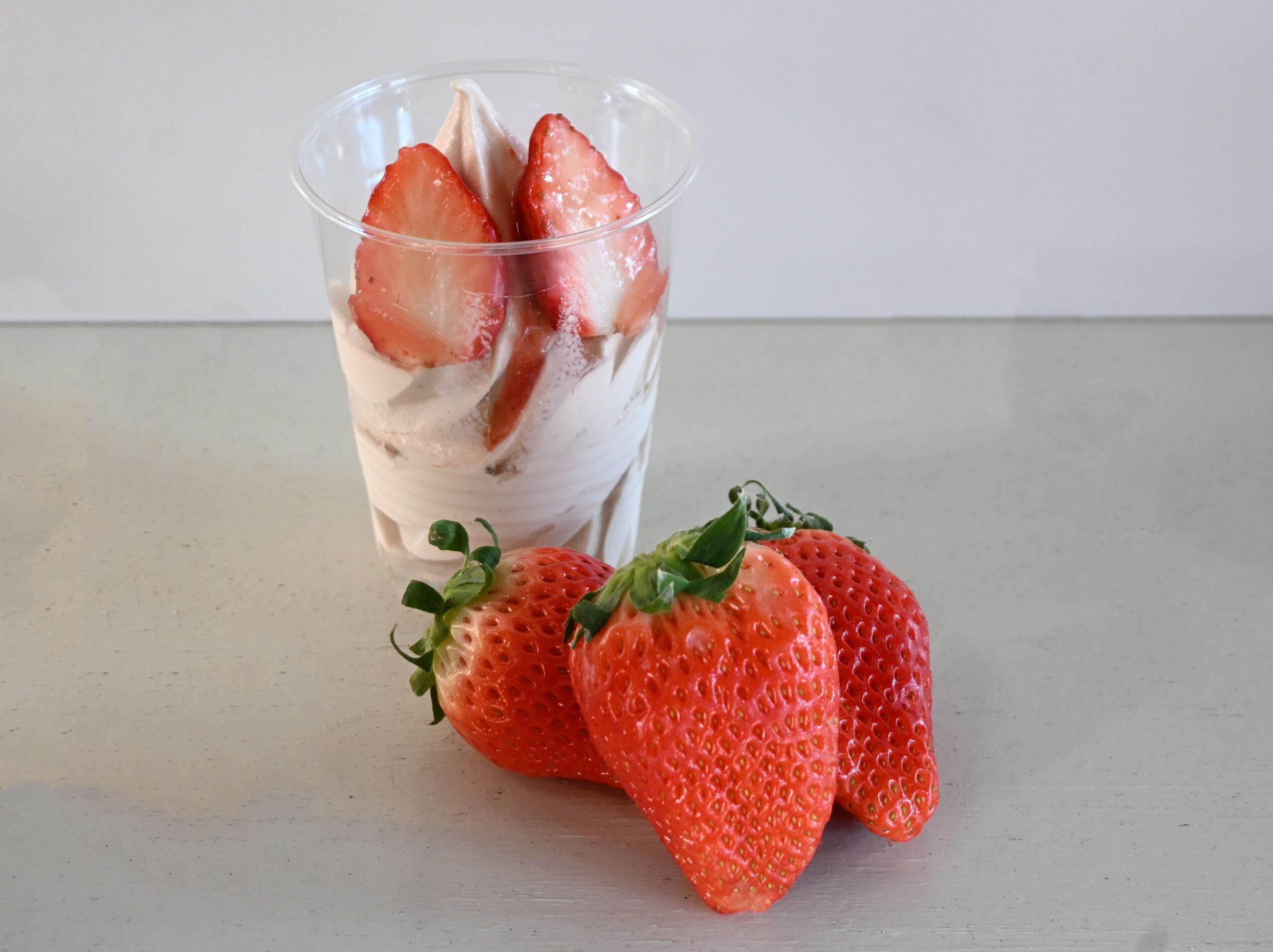 三重県産のいちごを練りこんだソフトクリームに、いちごといちごソースをトッピングしました。