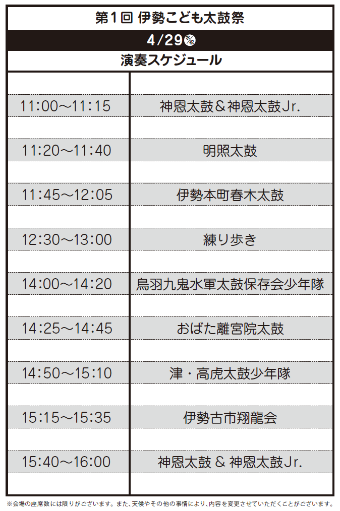 出 演/明照太鼓(伊勢)、伊勢古市翔龍会(伊勢)、おばた離宮院太鼓(伊勢)、伊勢本町春木太鼓(伊勢)