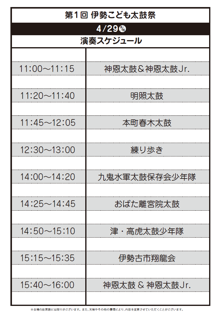 出 演/明照太鼓(伊勢)、伊勢古市翔龍会(伊勢)、おばた離宮院太鼓(伊勢)、本町春木太鼓(伊勢)