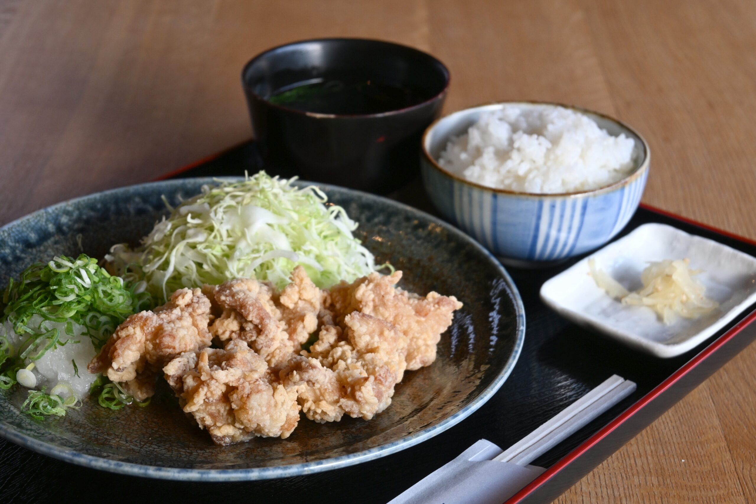 こだわりのからあげに、伊勢ねぎと大根おろしを添えました。ゆずポン酢でさっぱりとお召し上がりいただけます。