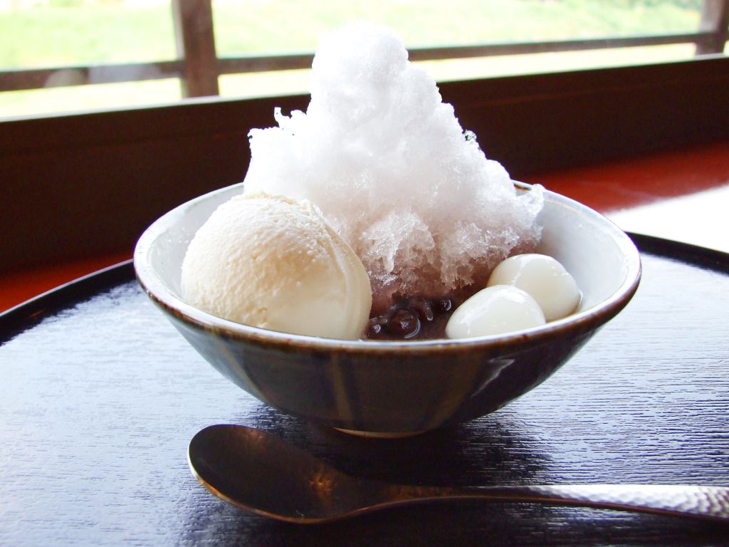 北海道産小豆を使用した自家製の冷たいぜんざいの上にふわふわのかき氷、アイスクリーム、白玉をのせたよくばりな一品です。氷を崩しながらお召し上がりください。
