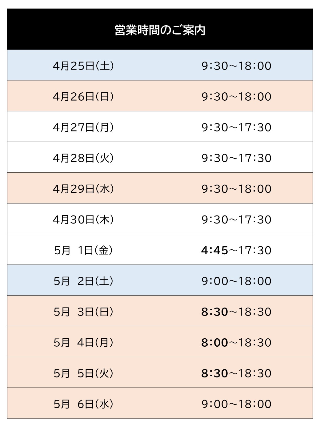 おかげ横丁のゴールデンウイークの営業時間をご案内いたします。