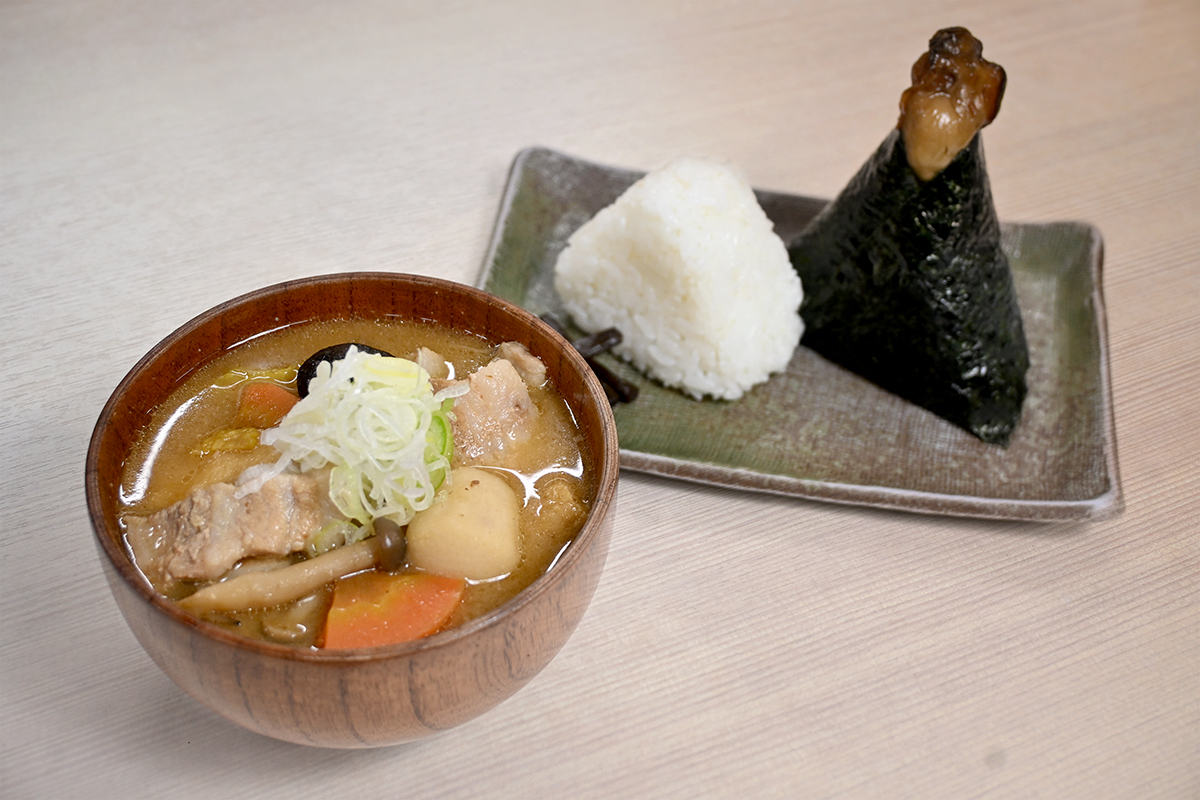 ――豚汁、牡蛎しぐれおにぎり、塩おにぎり