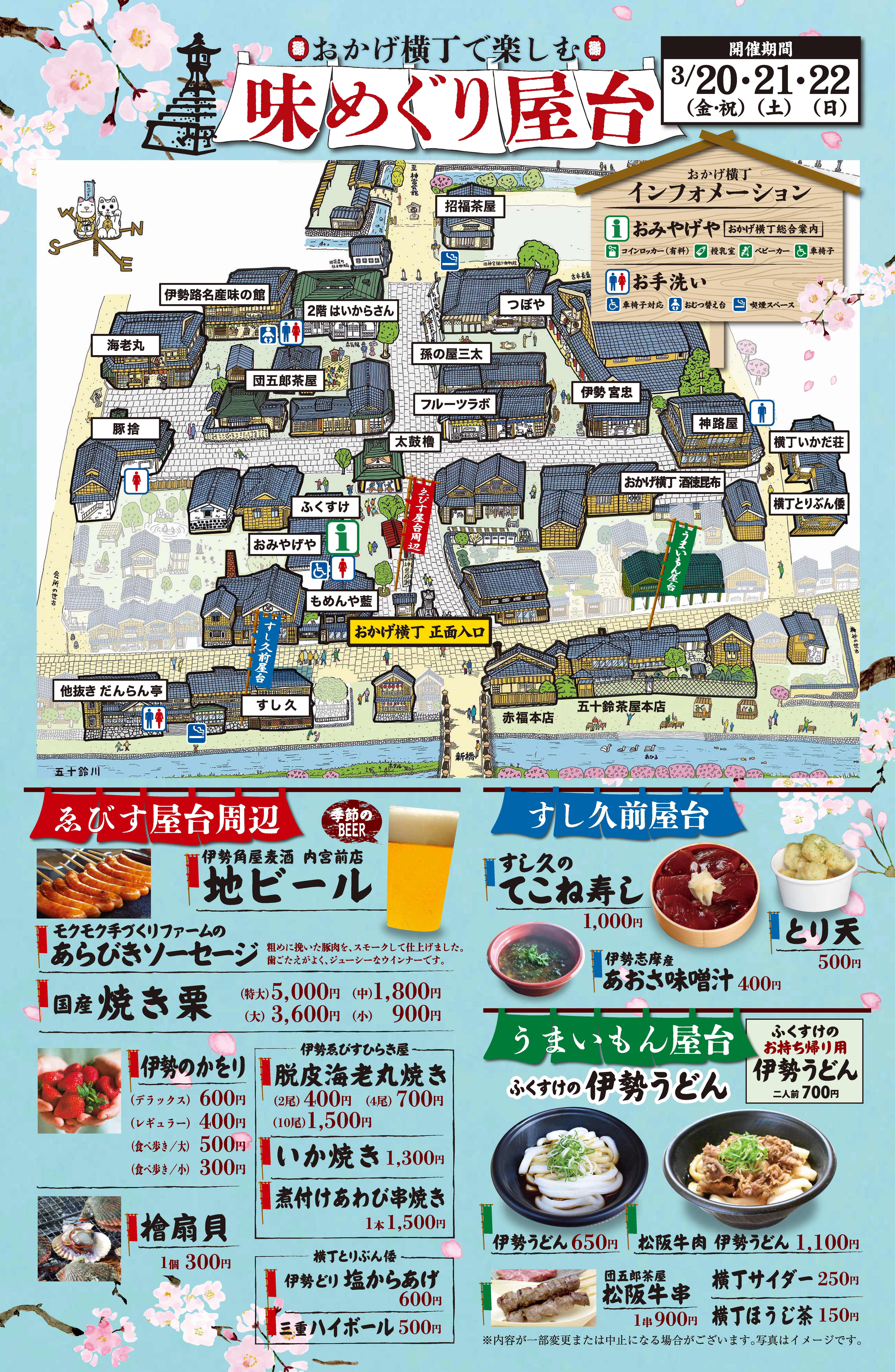 おかげ横丁では3月20日(金・祝)、21日(土)、22日(日)の3日間、「おかげ横丁で楽しむ味めぐり屋台」を開催いたします。